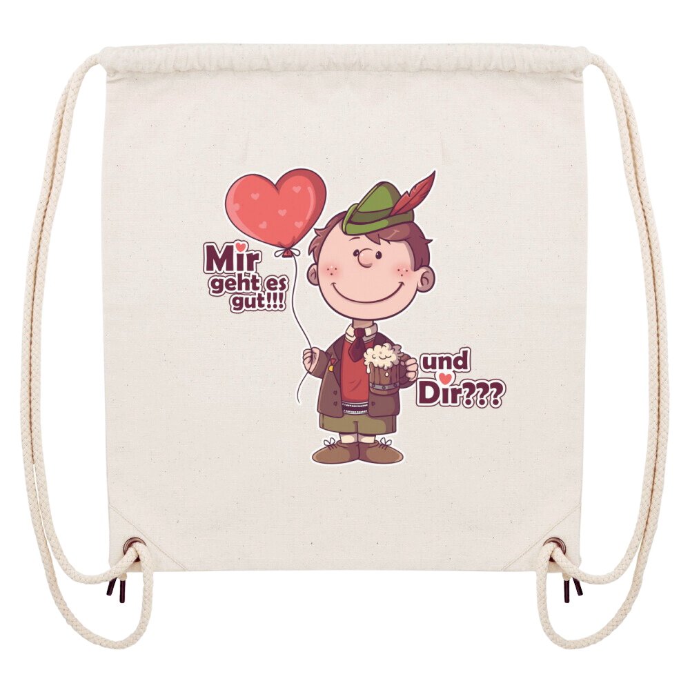 Unser Gym Bag "Mir geht's Gut" aus robuster Bio-Baumwolle, recyceltem Polyester und fairer Herstellung ist ein super Begleiter im Alltag oder im Gym.                Unser Aufdruck rundet die Gym Bag aussagekräftig ab.